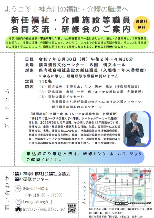 神奈川県内の福祉施設・事業所等に入職された新任職員の皆様にとって、本研修会が少しでもお役に立てればと願っています。
