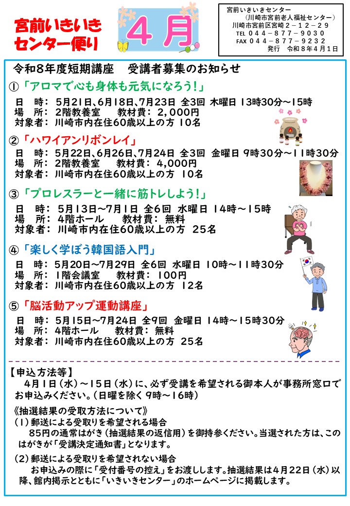 前期講座(4月~)、後期講座(10月~)、短期講座