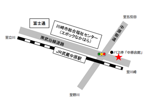 - 市営バス:「中原老人福祉センター入口」下車徒歩8分、「井田営業所前」下車徒歩15分、「中央療育センター前」下車徒歩2分