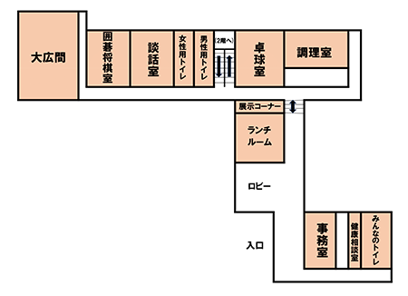 大広間・囲碁将棋室・談話室・卓球室・調理室・展示コーナー・ランチルーム・ロビー