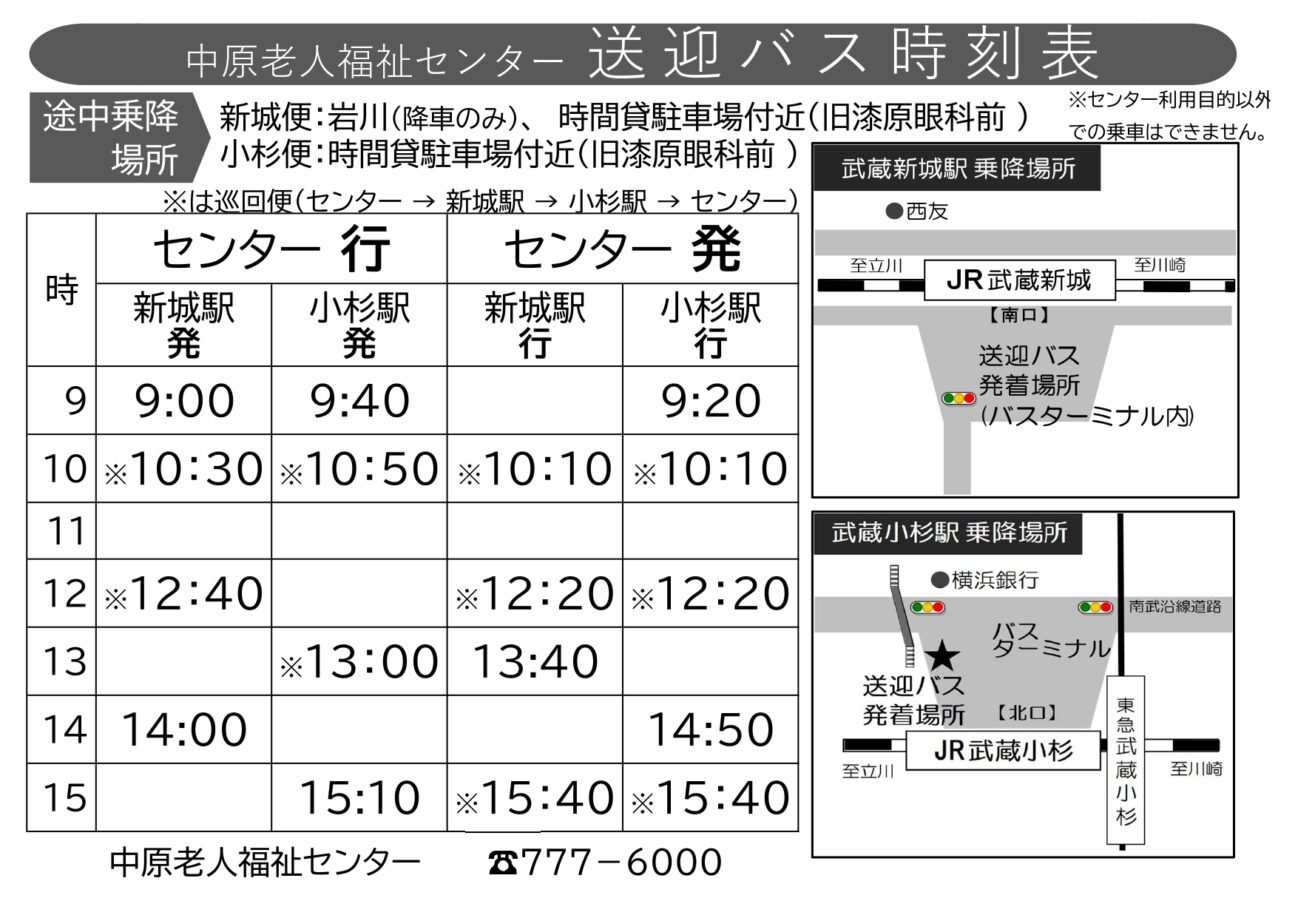 - 時刻表の表示はありません。武蔵新城駅または武蔵小杉駅の出発時刻から10分前後で到着予定ですが、交通事情により異なることがあります。なお、巡回バスの場合は、武蔵小杉駅を出発した時刻の10分前後になるのでご注意ください。