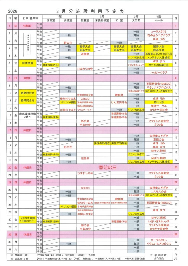 令和8年3月施設利用予定表