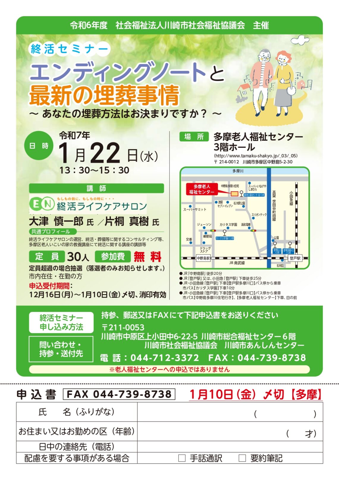 終活セミナー「エンディングノートと最新の埋葬事情~あなたの埋葬方法はお決まりですか?~(1/22 多摩区)」のご案内